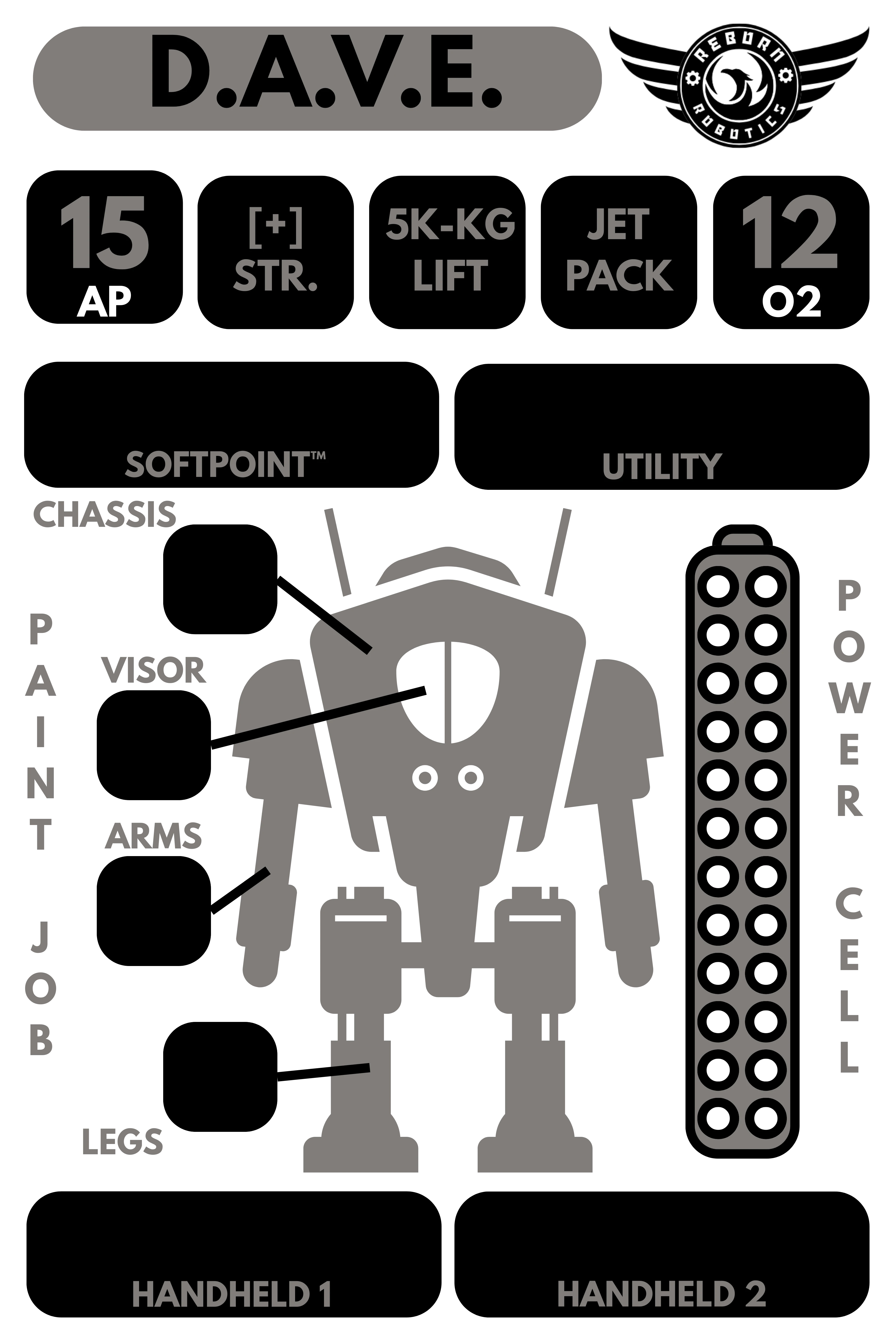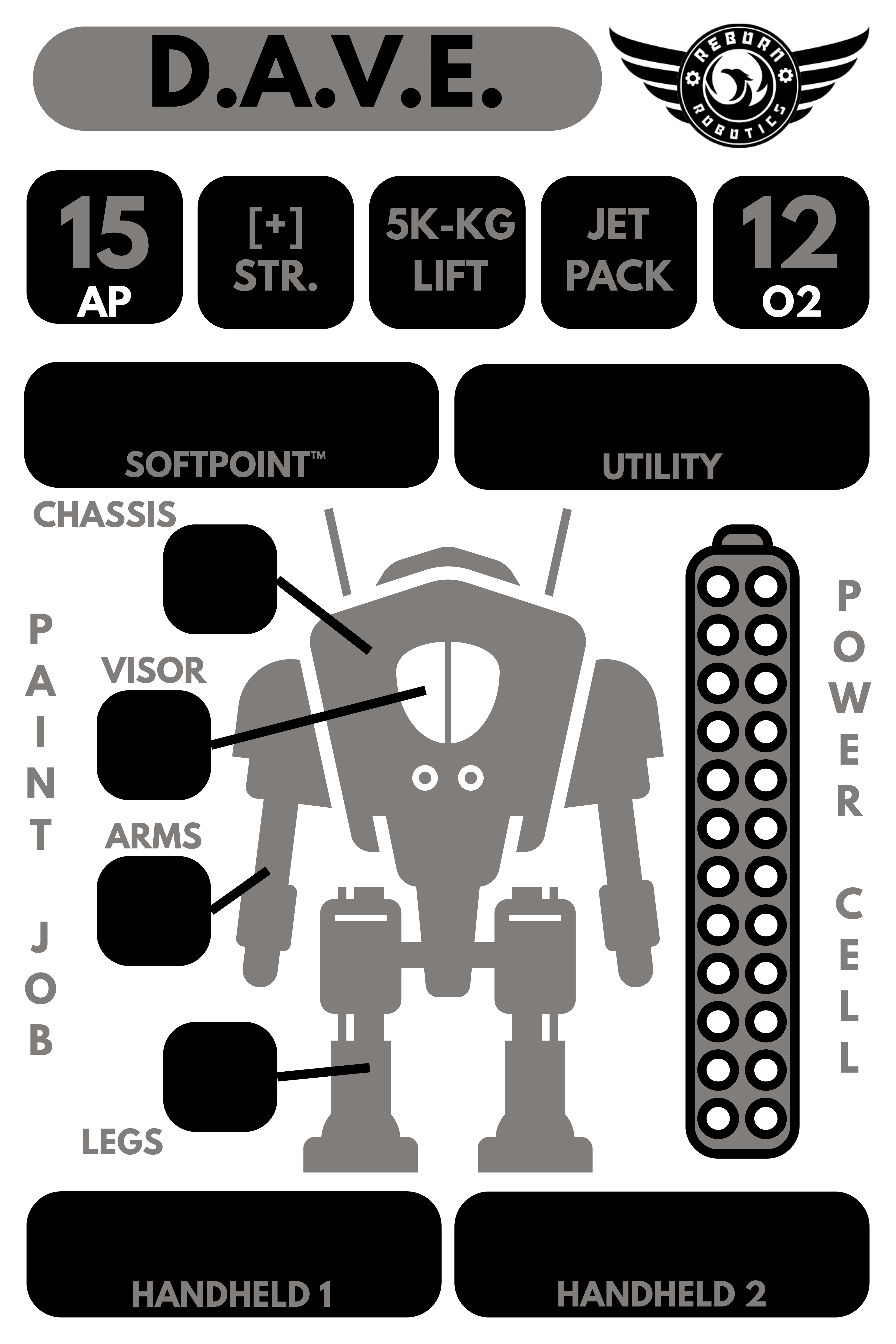 D.A.V.E. has four customizable components: Handhelds, Softpoints™, Utilities, and Paint Jobs. All costs listed are in addition to the base unit construction cost of 20mcr.