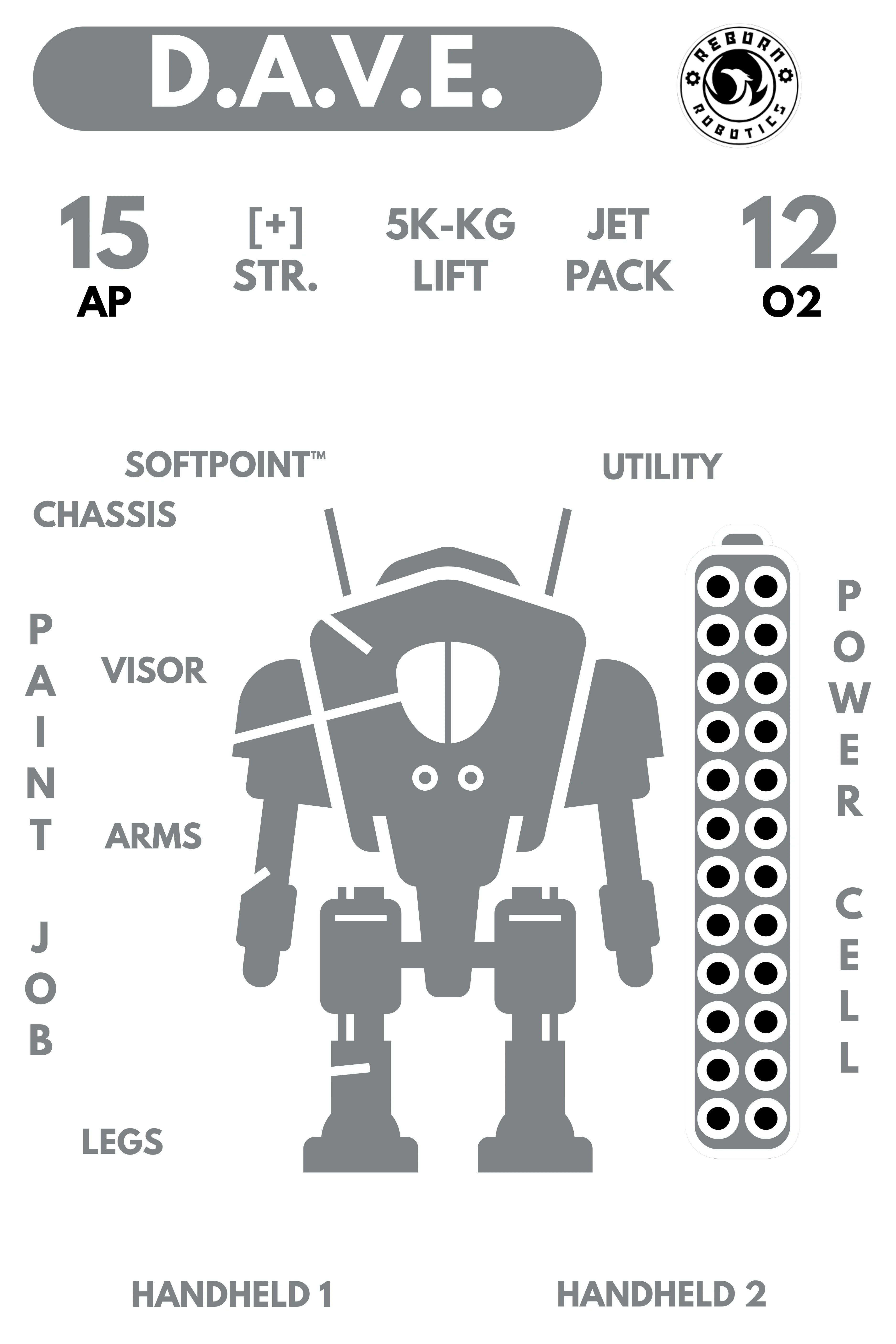 While piloting D.A.V.E., the pilot uses their own Stats and Skills to operate its systems, weapons, and utilities, but does not need to roll to lift objects up to 5000kg or use the Jetpack, and gains [+] on Strength checks. D.A.V.E. is also equipped with 12 hours of O2.